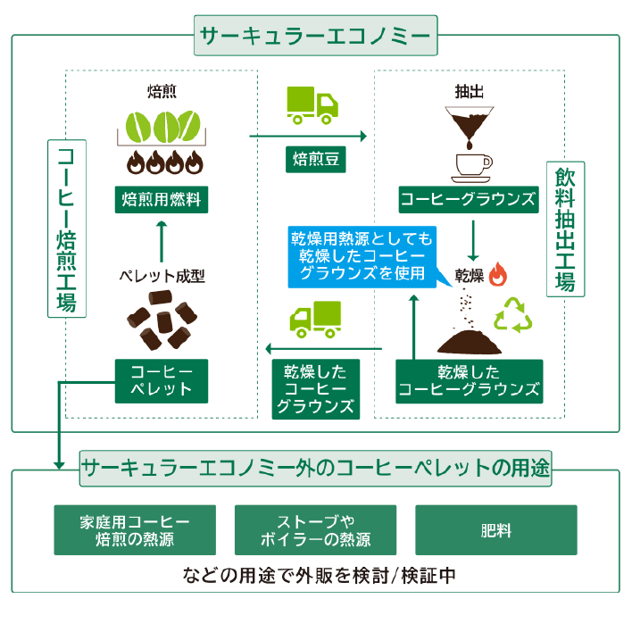 「グリーン焙煎」とは、コーヒーの抽出時に発生するコーヒーかす(コーヒーグラウンズ)を利用し、円筒形の固形燃料(ペレット)に加工し、このペレットを、都市ガスや化石燃料の代替熱源としてアップサイクルする焙煎方法です。このサーキュラーエコノミーの取り組みは、通常、廃棄物として処理されるコーヒーグラウンズの廃棄量削減や、焙煎時に化石燃料を用いないことで、温室効果ガス(GHG)排出量の削減に取り組んでいます。さらに、ペレットは焙煎だけでなく他の多様な用途にも使用することが可能で、GHG 排出の更なる削減に寄与し、一般的な商品としても世間に認識されることを目指しています。