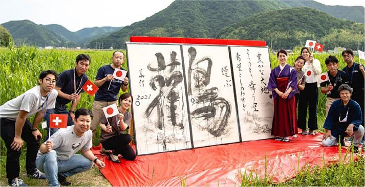 兵庫県北部に位置し、豊かな山と海に囲まれ、コウノトリが大空を舞う但馬(たじま)地域。この地域にある豊岡市では、日本やヨーロッパで「幸せを運ぶ縁起の良い鳥」として親しまれながら、絶滅危惧種に指定されているコウノトリの再生にいち早く取り組んできた象徴的なエリアです。ここで生産される「コウノトリ育むお米」は、コウノトリの野生復帰を支えるため、カエルやドジョウなど、コウノトリのエサとなる生き物が育つ環境づくりに取り組み、農薬不使用または75%以上の削減、化学肥料不使用、生き物調査の実施、冬期湛水、深水管理など、地球環境に優しい農法で生産されています。当社は、コウノトリの野生復帰を背景にした環境保全と農業振興を両立させ、持続可能な農業を体現しているこの取り組みに共感し、「コウノトリ育むお米」のEUへの販路開拓・輸出への協力をスタートさせました。2021年にはスイス向けの輸出が始まり、6月5日の世界環境デーに合わせて、豊岡市とスイスのジュネーブをオンラインでつなぎ、生産者による田んぼからの中継、コウノトリを背景にした書道家パフォーマンスやおにぎり作り等のイベントを配信しました。