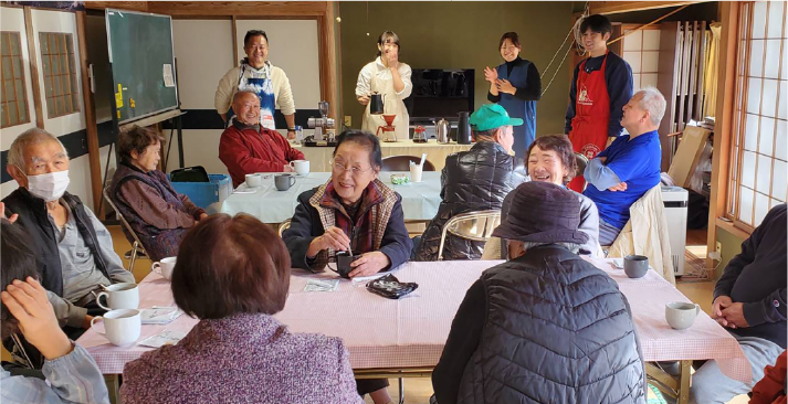 2024年に発生した能登半島地震。被災した石川県穴水町の仮設住宅にて、 現地で災害支援にあたる名古屋市の認定NPO法人「レスキューストックヤード」を通じ、2024年5月から1年間、社員が月1回2日間現地入りし、「日々の生活に良い変化を感じていただく」という目的のもと、 『穴水町カフェ』を開催。仮設住宅団地を中心に交流の場づくりとして、取扱い商材を使ったデザートや淹れたてのコーヒーの提供、麻袋を利用したワークショップ等を行い、住民の皆さんとの交流を深めました。