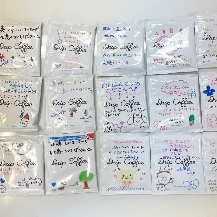 はじめは、カフェに来てくださる方々とどのように交流すればよいのか、また、言葉や態度を間違えて誰かを傷つけてしまわないかと心配していました。コーヒーを提供した際に「きのどくな」と言われ、何か気を悪くされたのかと不安になりましたが、それが能登弁で「ありがとう」 を意味する言葉だと教えていただき、とても温かい気持ちになりました。現地での支援活動には、1年間で約30名の当社グループ社員が参加。一方、現地を訪問できない社員も多かったため、現地訪問以外で支援できる方法として、当社で製造したドリップコーヒーにメッセージを添えたり、現地で実施するワークショップの事前準備やオリジナルレシピの開発を行いました。住民の皆さんが楽しそうに笑顔で過ごされていたり、嬉しそうな表情で帰っていく姿を見て、この活動には大きな意義があるのだと実感することができました。