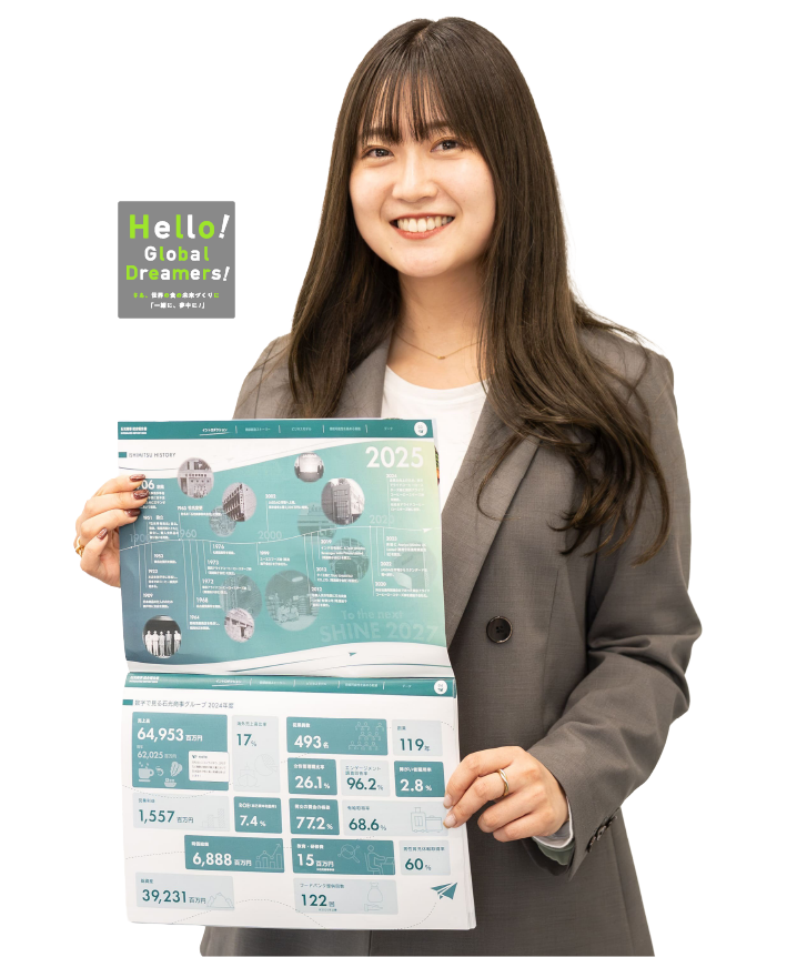 配属後2年間は、総務人事チームと協力しながら、人事制度改革を進めました。同時に統合報告書という会社全体の業績などの財務情報と、人財・環境などの非財務情報をあわせて、会社が今どんな価値を生み、将来どう成長していくかをまとめる経営資料を、石光らしくリニューアルする役割を担うことになります。未知な領域まで把握してまとめていくチャレンジングな仕事でしたが、関わってくださる全ての社員の皆さんのおかげで、毎年より良いものへと進化させることができています。